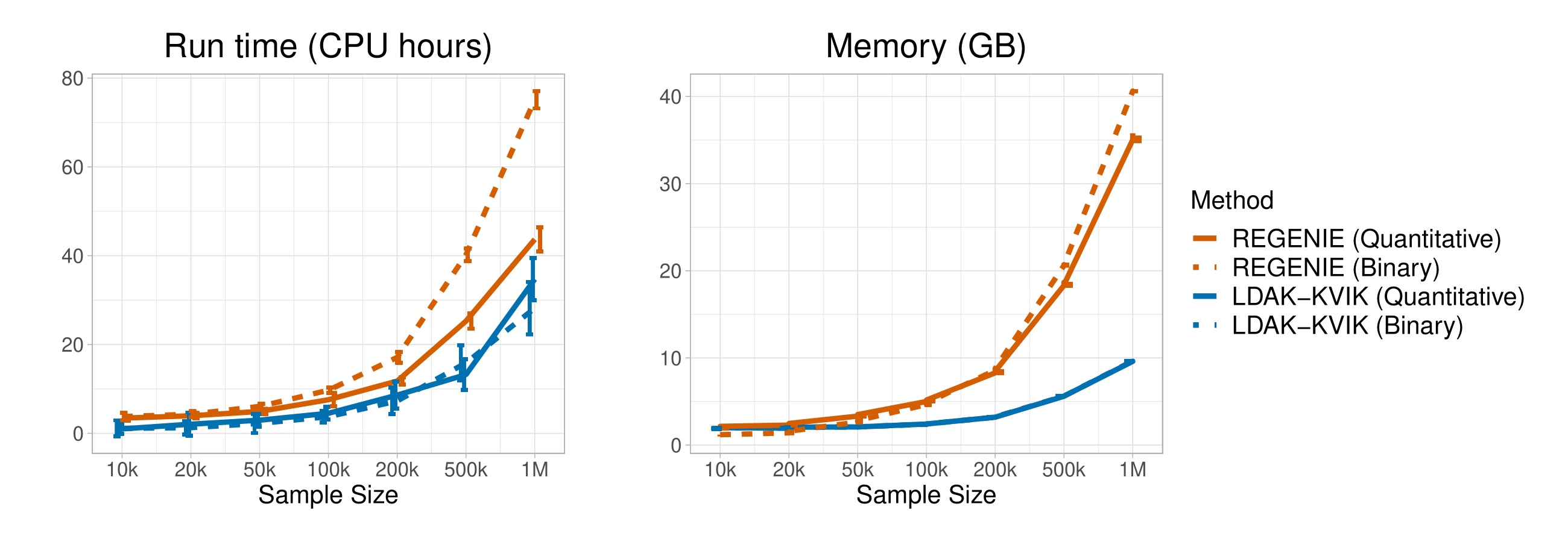 These results indicate that it is feasible to apply LDAK-KVIK to very large datasets (e.g., a million individuals). In general, we find that LDAK-KVIK is faster than REGENIE for all sample sizes, and for both quantitative and binary phenotypes. While the two tools have similar memory requirements for small samples sizes, LDAK-KVIK uses noticeably less memory than REGENIE for larger sample sizes (e.g., more than 50k individuals).